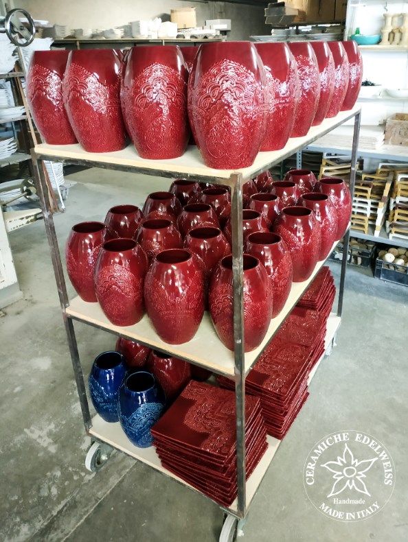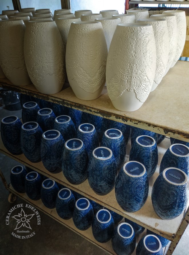 18-19. sono iniziate le produzioni massive, i nostri artigiani hanno realizzato manualmente il semilavorato degli oggetti. Dopo una prima cottura in forno, le ceramiche sono state smaltate dai nostri maestri ceramisti e cotti un’ultima volta in forno.