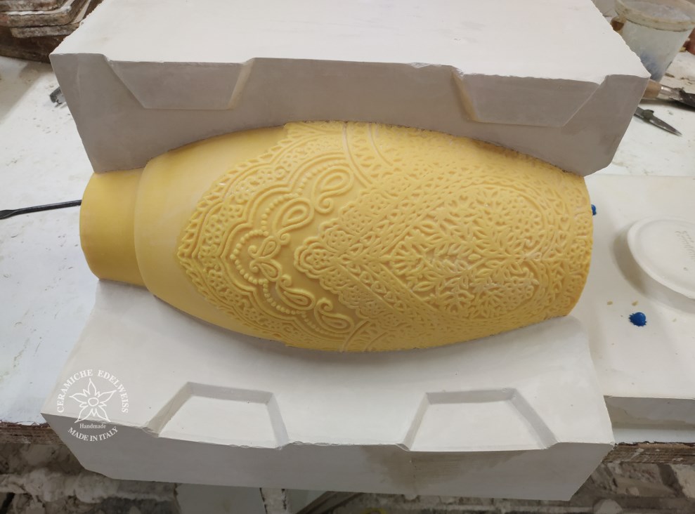 12. E’ stata modellata la forma originale in gomma per creare gli stampi a colaggio per i vasi e a pressa per il centrotavola a per il piatto