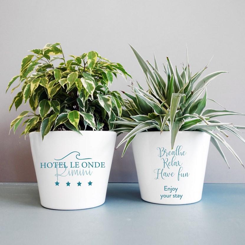 Personalisierte Keramikvase mit Widmung: Ceramiche Edelweiss, ha realizzato dei coprivasi in ceramica su misura smaltati bianchi per una nota azienda, che propone online la personalizzazione.