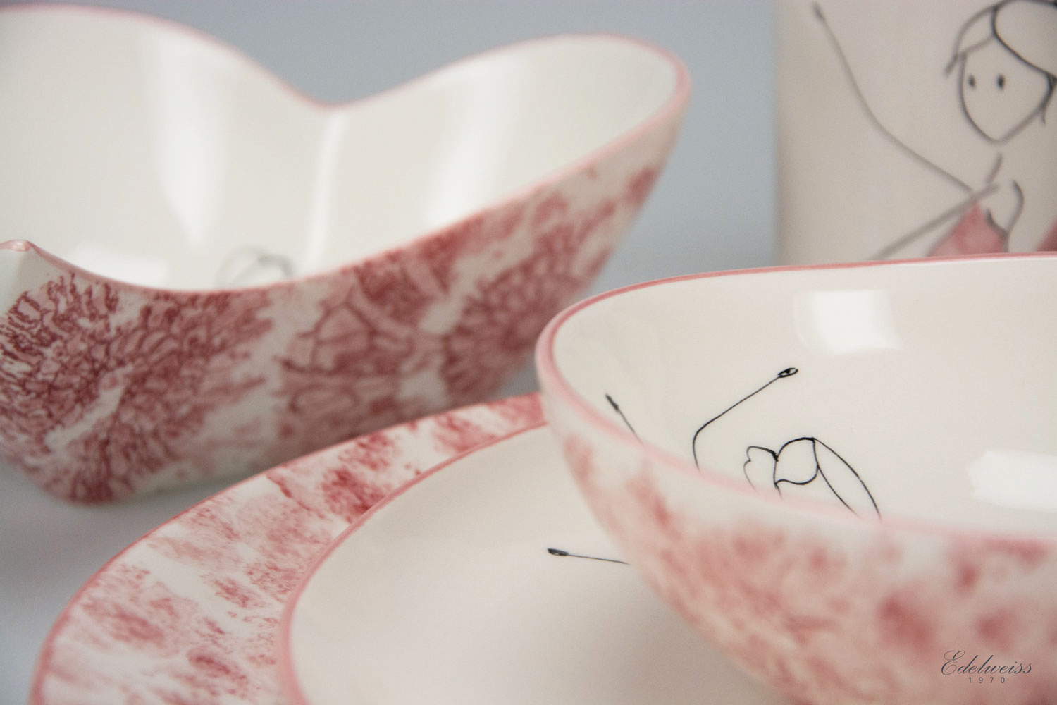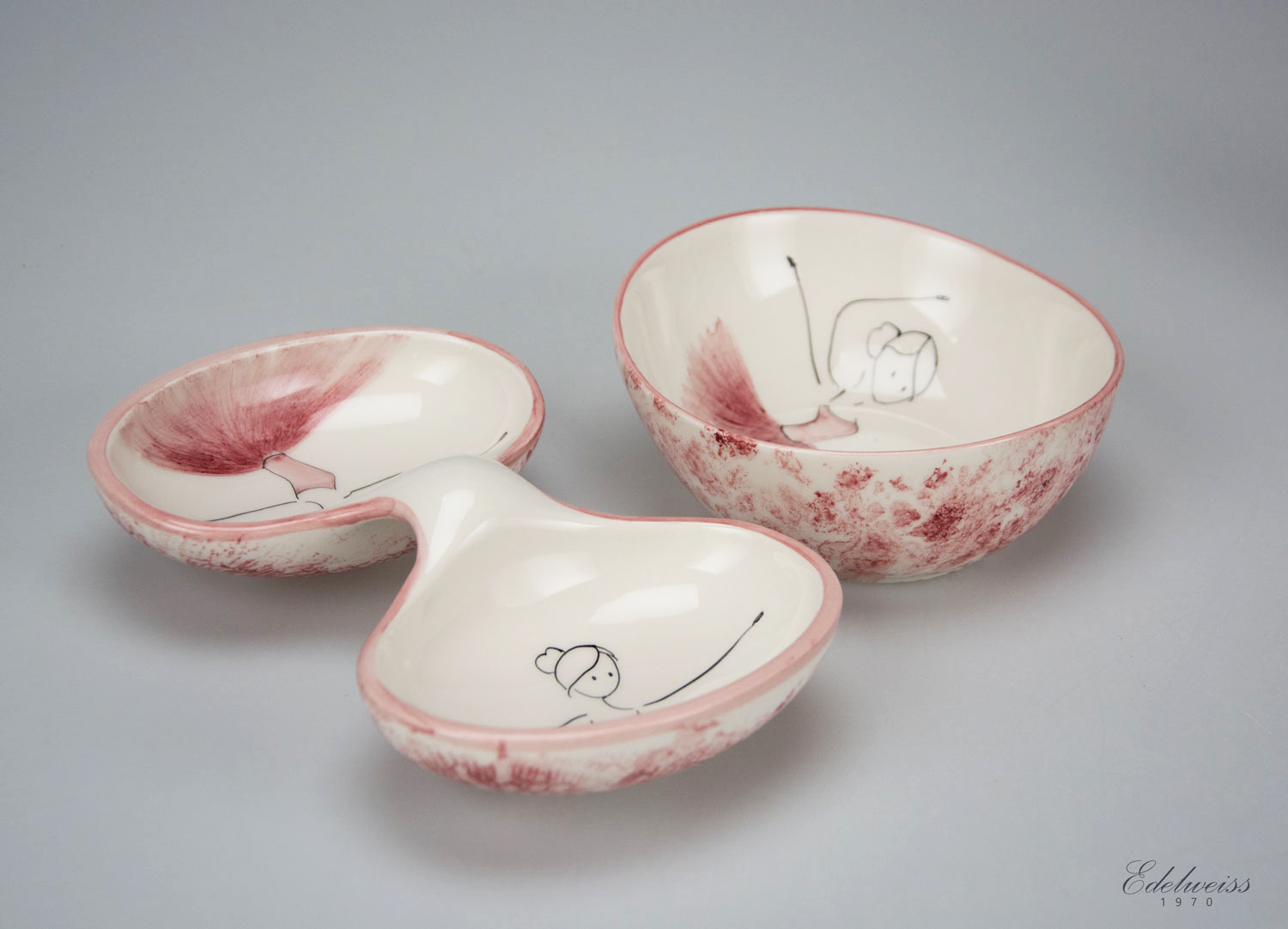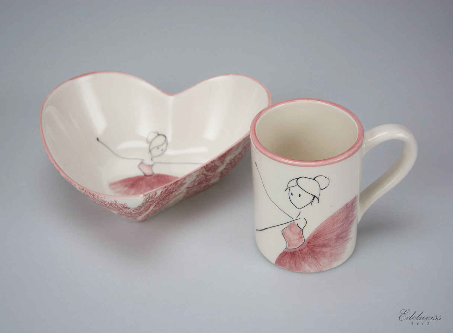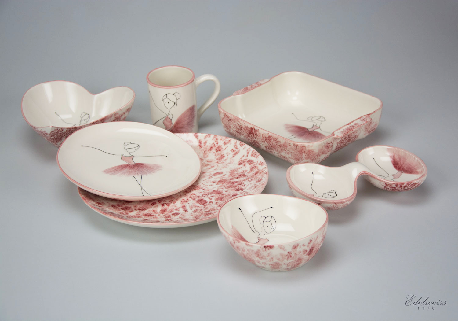 Ogni pezzo di questo set è una vera opera d’arte. Le ballerine, rappresentate in pose leggere ed eleganti, sembrano quasi danzare sulla superficie delle ciotole, piatti e tazze. Il tratto semplice ma espressivo delle illustrazioni, unito al rosa delicato dei tutù, dona un senso di movimento e leggerezza, facendo sì che ogni portata diventi un momento di poesia visiva.