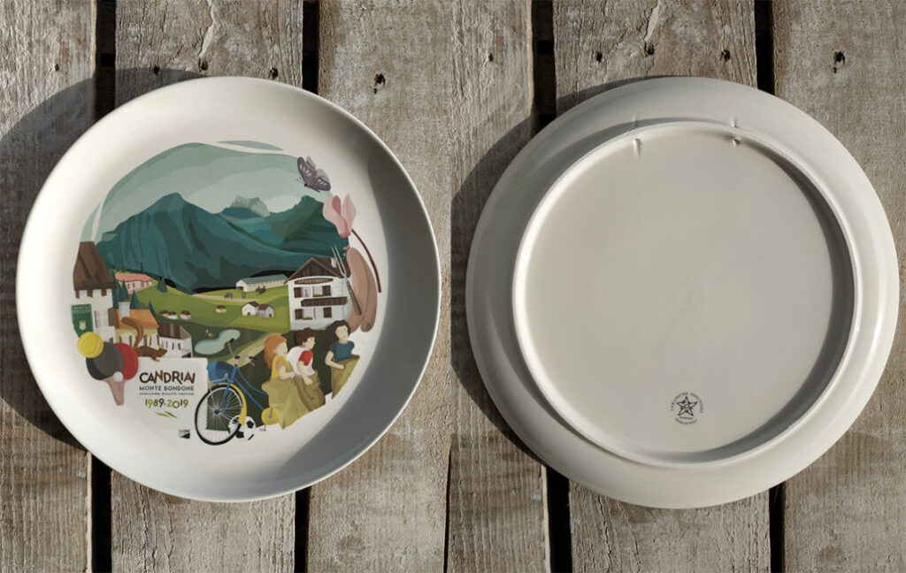 Piatto decorativo da muro in ceramica per associazioni ed iniziative turistiche: Ceramiche Edelweiss, su richiesta dell’associazione turistica Candriai Monte Bondone del Trentino Alto Adige, ha realizzato per un evento dei piatti decorativi da appendere al muro in ceramica con l’applicazione di una grande decalcomania personalizzata con l’immagine di un paesaggio montano tipico e del logo dell’associazione. E’ stata creata anche una scatola su misura per ogni pezzo, per presentare i piatti in modo completo ed elegante.