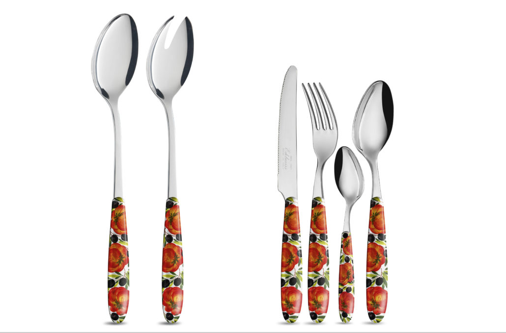 Le posate decorate sono composte da: posto tavola classico con cucchiaio, forchetta e coltello, forchettina antipasto/dolce, cucchiaino caffè, rotella taglia pizza, set insalata.