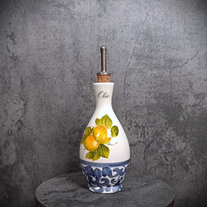 Essenziale per ogni tavola è la bottiglia d’olio, se poi è anche fatta e dipinta a mano allora metterla in tavola sarà una soddisfazione. Il decoro damascato blu cobalto ed i limoni ricordano il profumo delle terre che si affacciano sul mediterraneo, i colori e la sua forma si abbinano facilmente ad ogni stile.