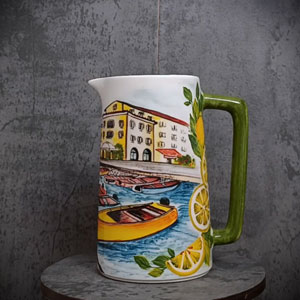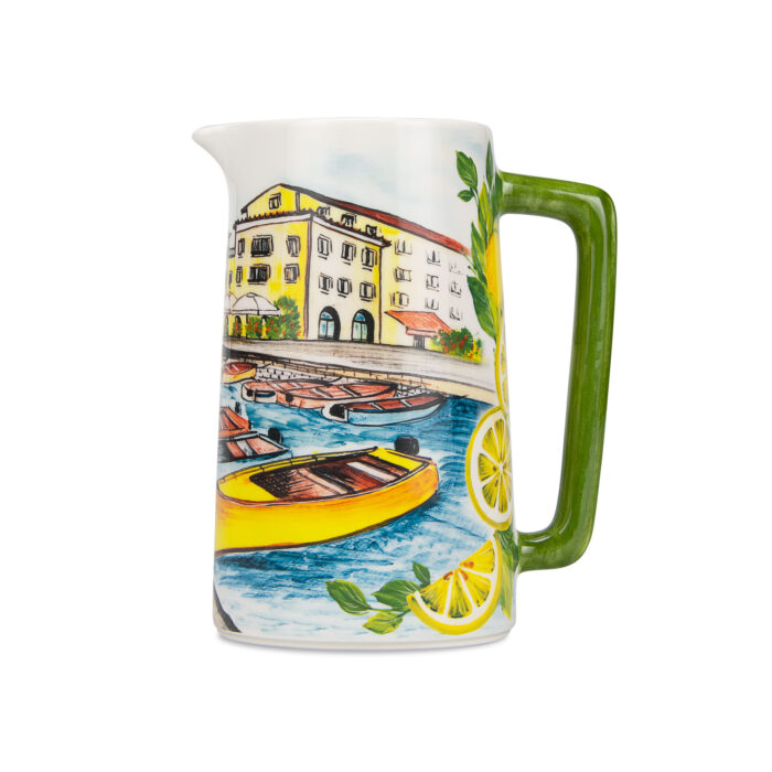 Porta in tavola il fascino dell’Italia con le nostre brocche in ceramica artigianale, ispirate alle località più amate del Bel Paese. Ogni brocca è un piccolo capolavoro decorato a mano e rifinito con decalcomanie artistiche che raccontano scorci marini, barche colorate e limoni mediterranei.