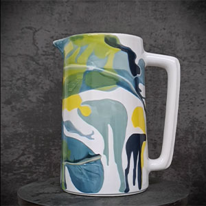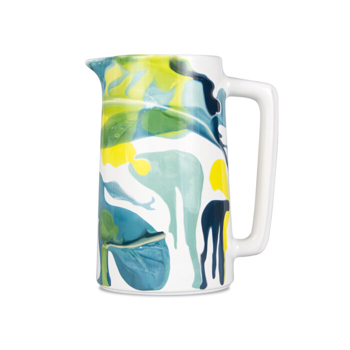 Le caraffe in ceramica artigianale fatta a mano unita al gesto dell’artista creano un’atmosfera vivace, capace di dialogare con ambienti e stili diversi mantenendo una chiara identità artistica.