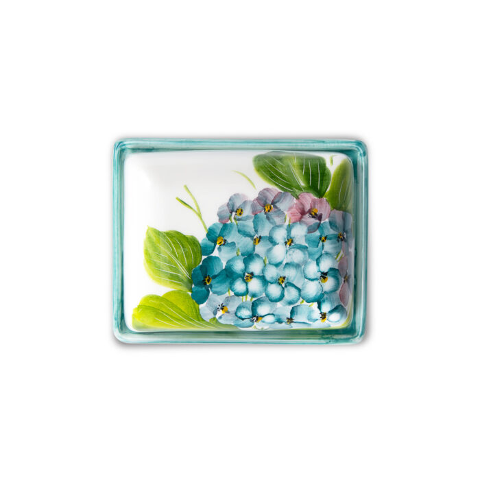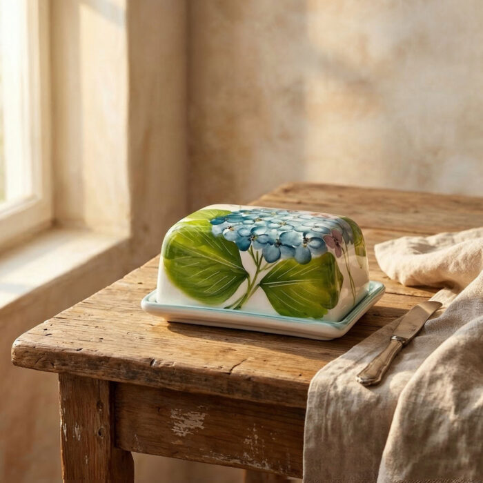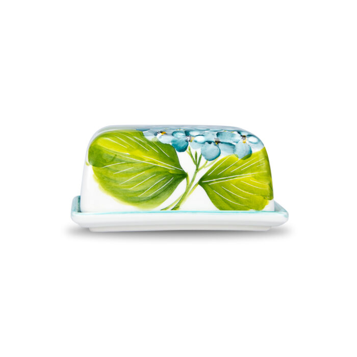 Questa burriera con ortensie dipinte a mano presenta un design fresco e pulito ma che richiama il classico, si abbina perfettamente ad uno stile elegante e country chic.