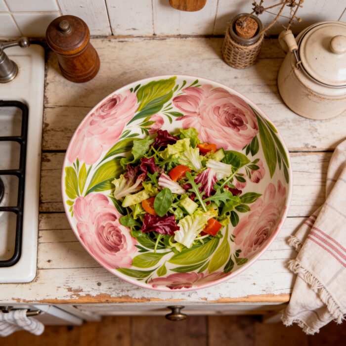 Le ciotole ed insalatiere con rose decorate a mano, moderne ed essenziali come le loro forme, donano un tocco di stile ad ogni cucina che non vuole rinunciare alla funzionalità.
