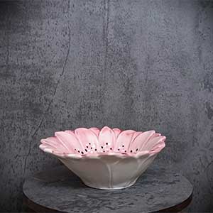 Ciotola in ceramica artigianale a forma di margherita, pratica, elegante e dal design unico. Le morbide pennellate dai colori accesi, realizzate a mano, e i dettagli finemente curati esaltano le linee dei petali in rilievo creando tridimensionalità. Una collezione dal sapore shabby chic in chiave moderna.