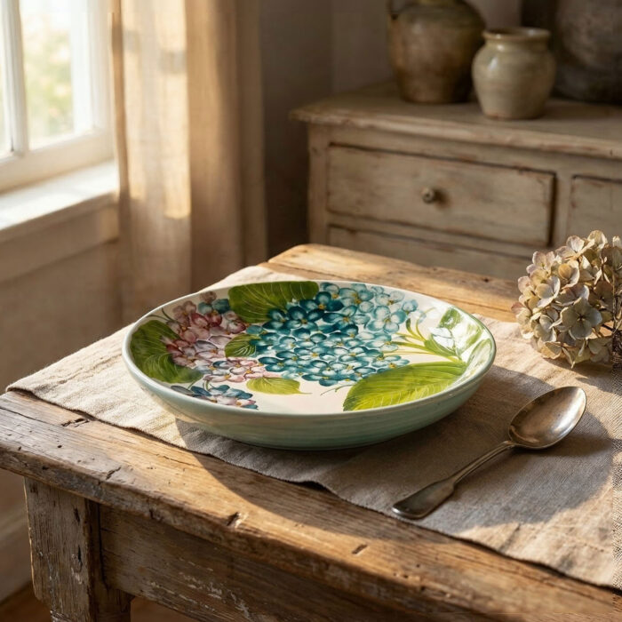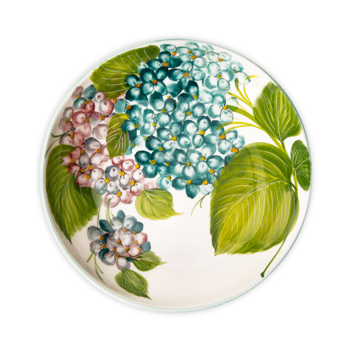 Ideale per servire zuppe, paste o piatti unici con stile. Perfetto per impreziosire la tavola con un tocco floreale grazie alle ortensie dipinte a mano.