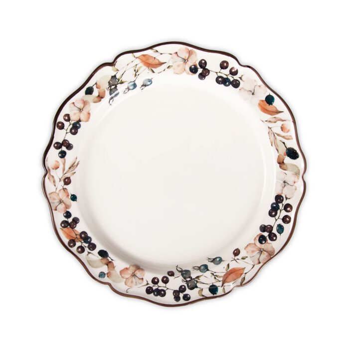 Piatto piano da portata caratterizzato da un’elegante forma ed una raffinata decalcomania applicata a mano.