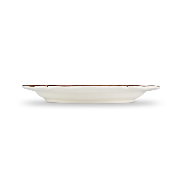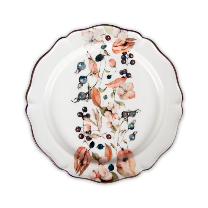 Piatto piano da portata caratterizzato da un’elegante forma ed una raffinata decalcomania applicata a mano.