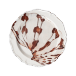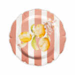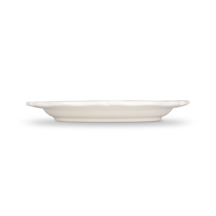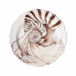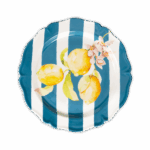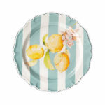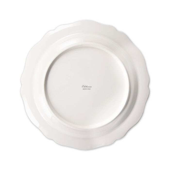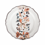 Piatto piano da portata caratterizzato da un’elegante forma ed una raffinata decalcomania applicata a mano.