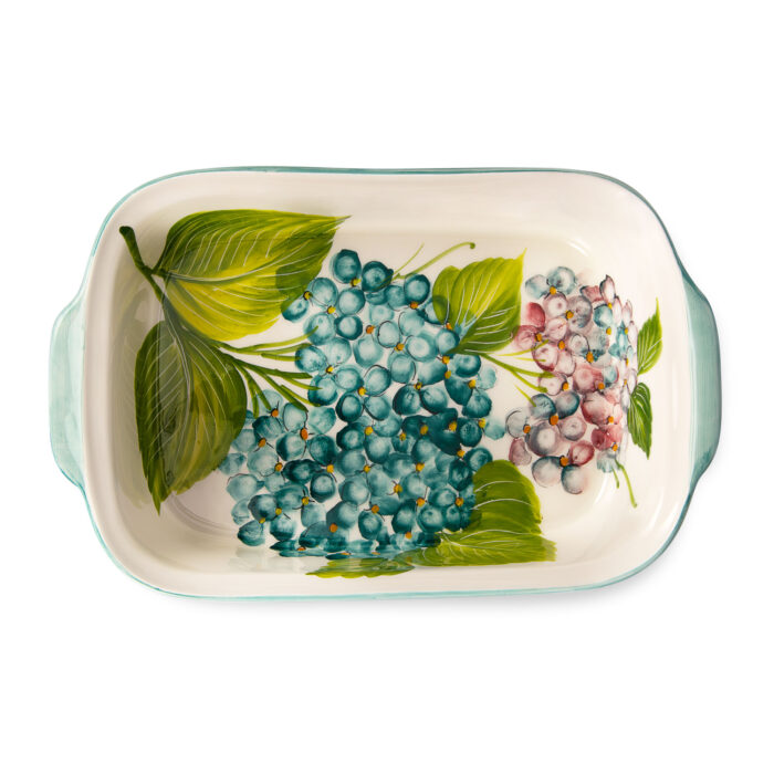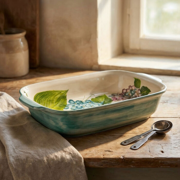 La pirofila decorata con ortensie è un perfetto equilibrio tra semplicità e raffinatezza. Ogni pennellata si distingue per la sua forma e intensità, rendendo ogni pezzo unico. Un tocco fresco e floreale che aggiunge carattere e stile alla tua tavola e valorizza ogni preparazione con gusto e colore.
