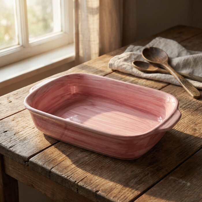 La pirofila monocolore rosa è elegante e moderna, semplice ma unica. Ogni pennellata si distingue per la forma e per la sua intensità. Un fresco tocco di stile sulla tavola e in cucina.