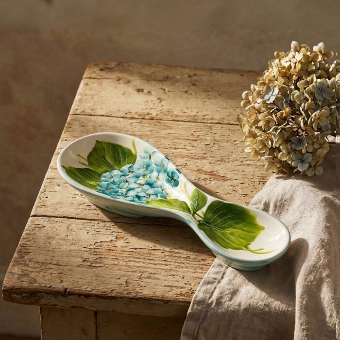 Il poggiamestolo decorato con ortensie è un accessorio da cucina unico nel suo genere: unisce funzionalità e stile con un design elegante e moderno. Ogni dettaglio è curato con passione, rendendo ogni pezzo diverso dall’altro grazie a pennellate ricche di colore e intensità. Un complemento ideale per chi cerca accessori cucina in ceramica decorata con fiori.