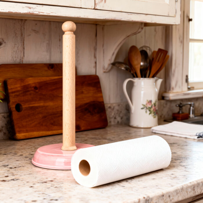 Portarotolo universale da cucina realizzato e dipinto a mano. Garantisce una base solida facilitando lo strappo del foglio, facile e rapido da ricaricare con rotoli di diametri ed altezze diverse. Il corpo centrale in legno è fissato tramite una vite sotto la base in ceramica.