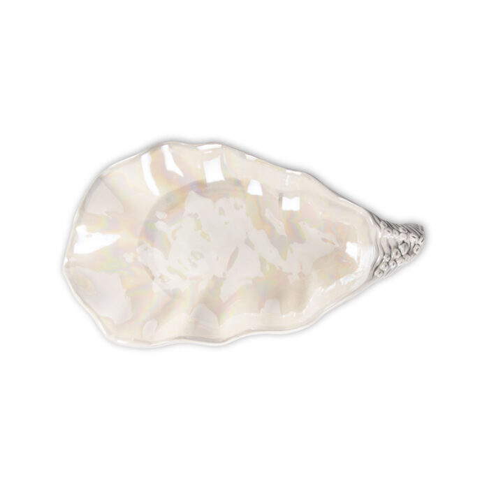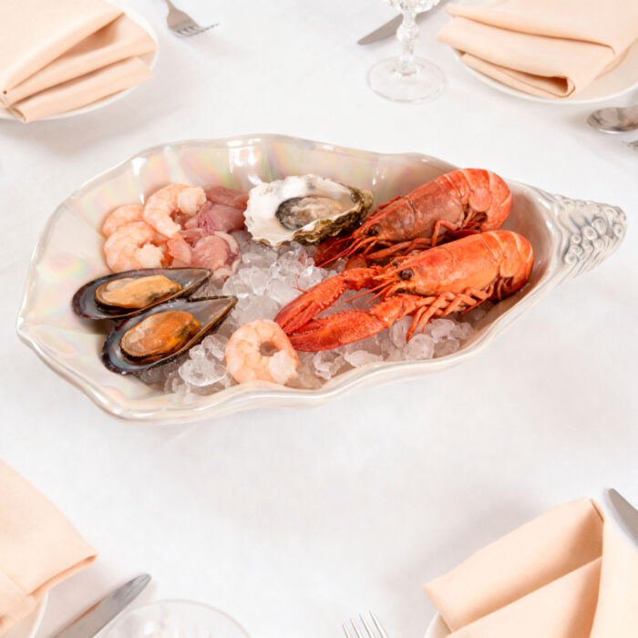 Perfetto per servire e gustare a regola d’arte ostriche, crostacei, pesce o caviale. Il vassoio riprende fedelmente l’ostrica nella sua forma con l’aggiunta di un effetto madreperla che lo rende ancora più prezioso.