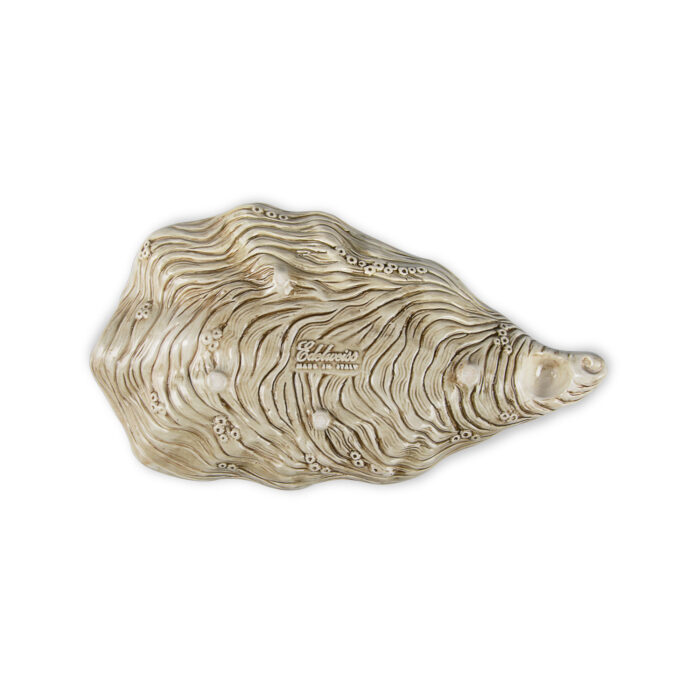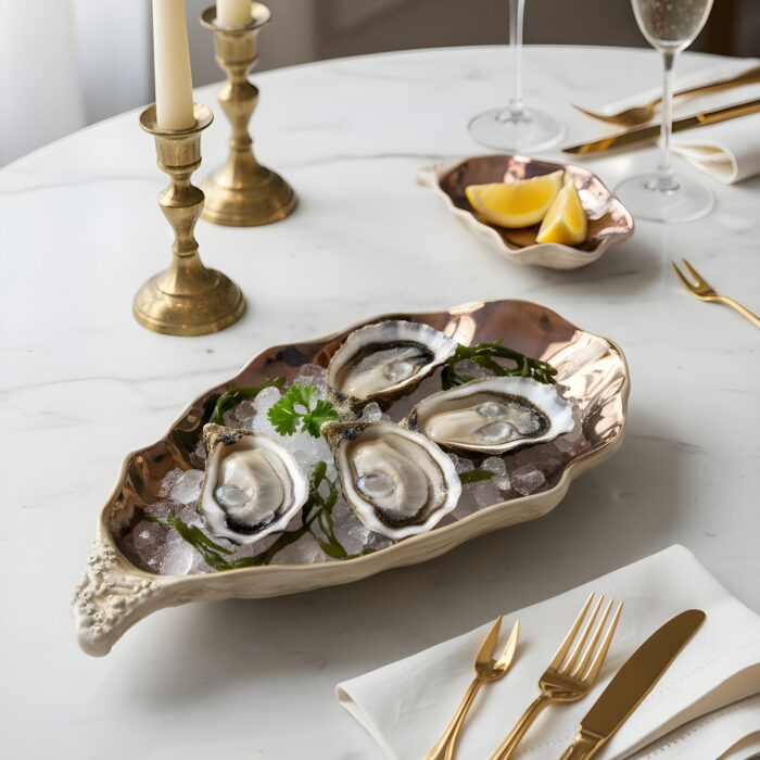 Perfetto per servire e gustare a regola d’arte ostriche, crostacei, pesce o caviale. Il vassoio riprende fedelmente l’ostrica nella sua forma con l’aggiunta di un effetto ramato che la rende un oggetto di design unico.