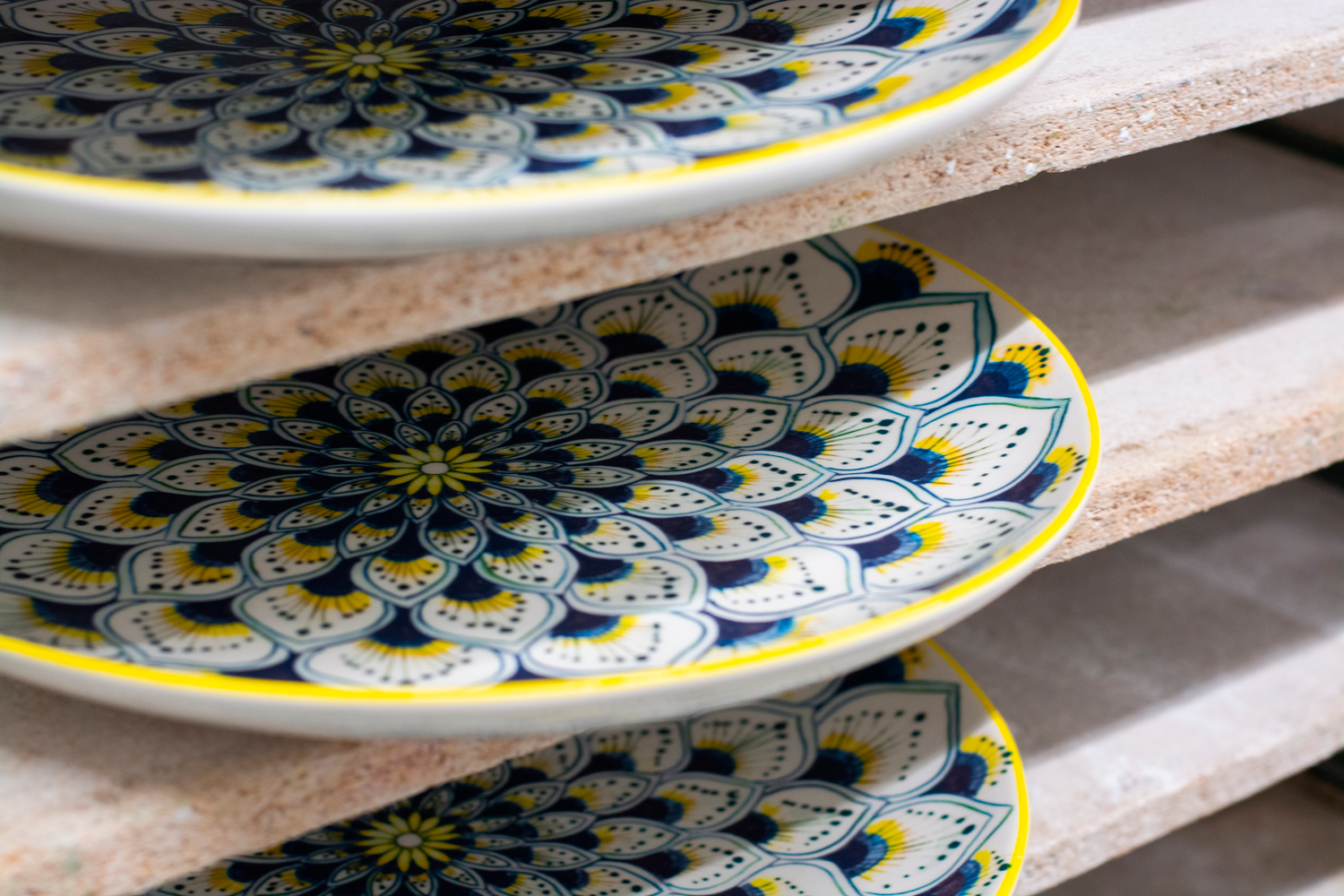 Questi piatti in ceramica artigianale sono opere uniche, realizzate con una combinazione di tecniche tradizionali e moderne (pittura a mano e decalcomania). Per questo ordine sono stati realizzati in due dimensioni: