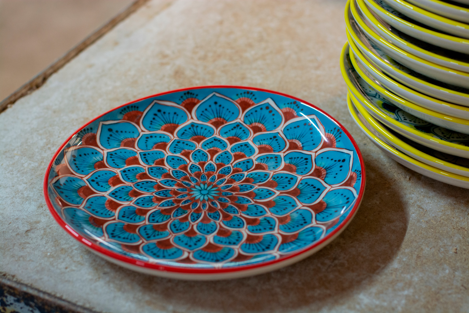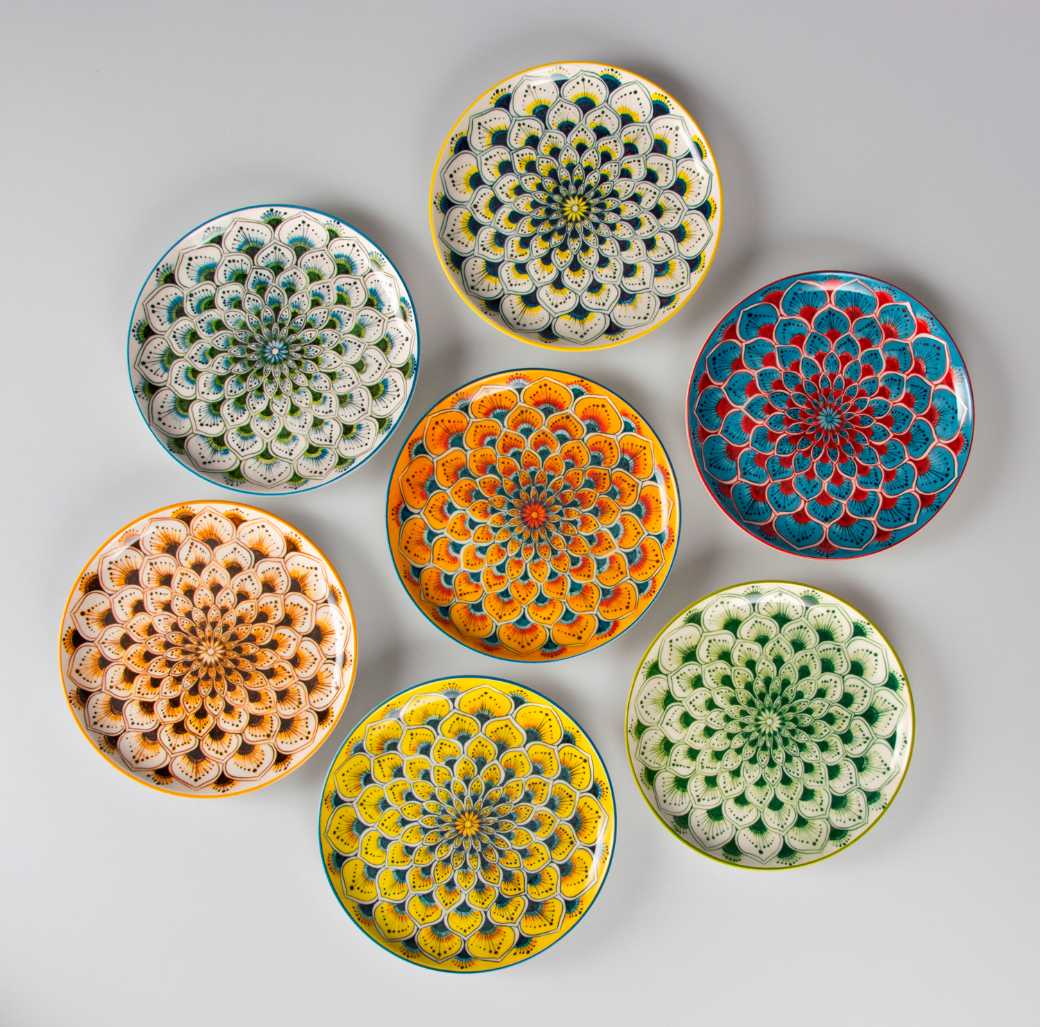 ogni pezzo è modellato con cura, cotto e lavorato a mano per renderlo unico. Il bordo è dipinto a pennello con colori vivaci, mentre il decoro interno è applicato con decalcomania, garantendo precisione e bellezza. Il disegno a penna di pavone, che si espande dall’interno verso l’esterno del piatto, crea un effetto ottico affascinante e moderno. I colori brillanti aggiungono allegria e freschezza, rendendo ogni piatto un elemento decorativo unico per qualsiasi ambiente.