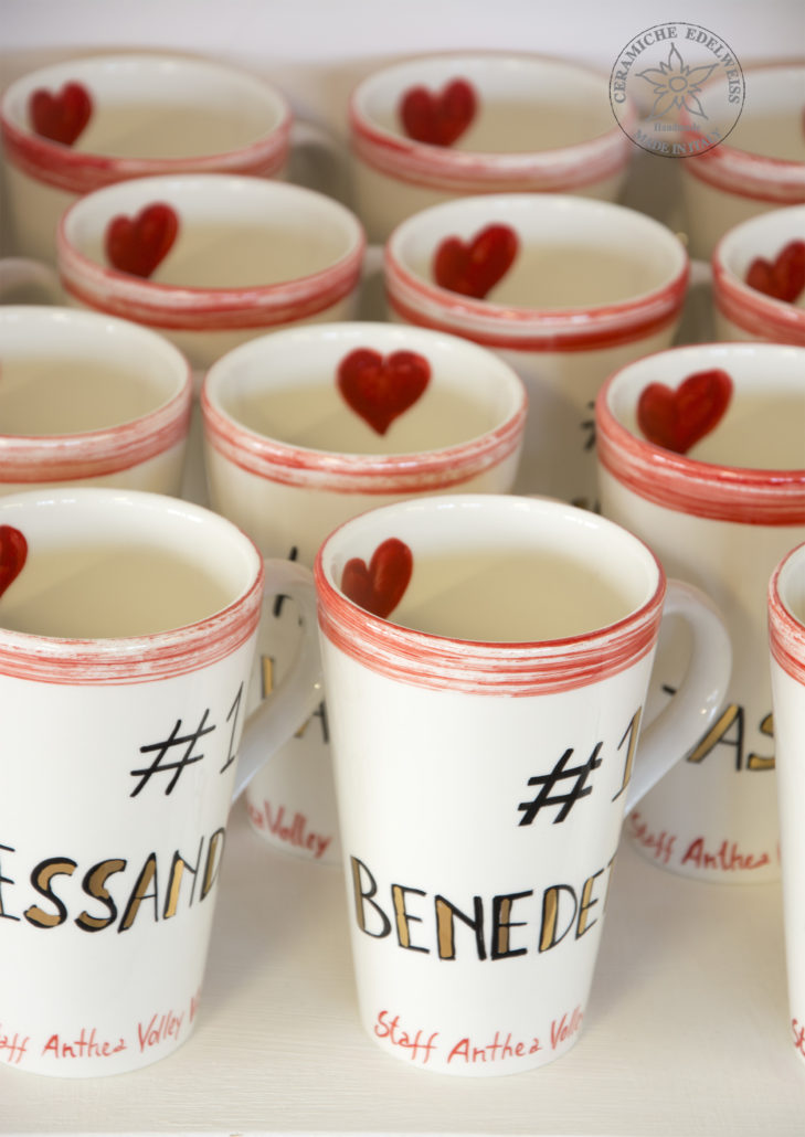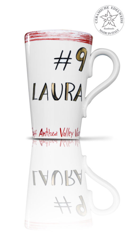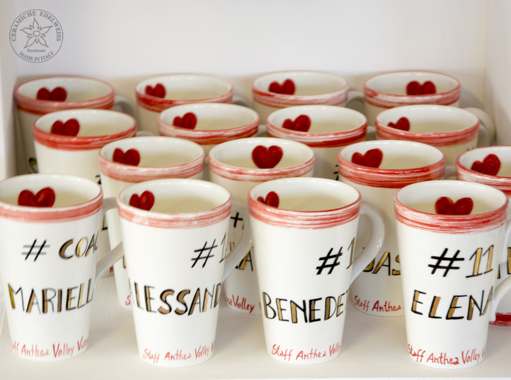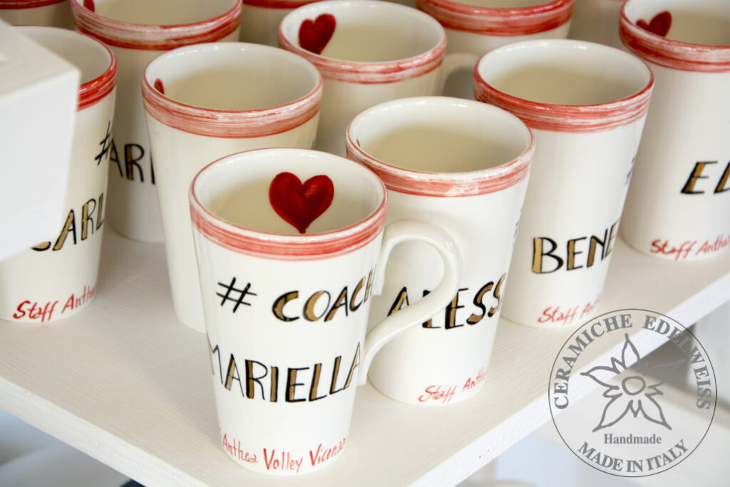 Per le prossime feste natalizie, per esempio, la squadra di pallavolo Anthea di Vicenza si è rivolta a noi per la realizzazione di tazze/mug personalizzate. Sono state dipinte a mano dai nostri pittori con il nome delle giocatrici della squadra e prima della terza cottura in forno, sono stati aggiunti dei dettagli in oro, per impreziosirli ulteriormente.